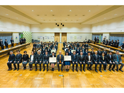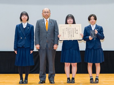 農林水産大臣受賞者(高校の部)と根本農林水産副大臣(左から2人目)
