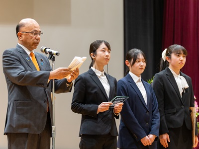 農林水産大臣賞(大学・専門学校の部)の祝辞を述べる根本農林水産副大臣(左)