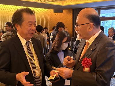 3月6日 根本農林水産副大臣は、GIシンポジウム「GI制度10年の軌跡と未来戦略」の交流会に出席し、挨拶を行いました。 また、参加した生産者団体とGIを活用した地域活性化について意見交換を行いました。