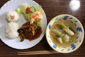 子どもたちが喜ぶように、食物学科の学生たちが考案したハンバーグと野菜スープ。