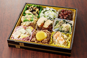 ごぼうとひじきの炒め煮や、大和ほうじ茶香る水羊羹などが入った「大和の恵み弁当」。