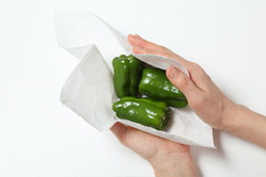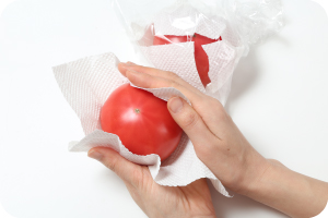 高い気温で栽培された夏野菜は寒さに弱いことから、キッチンペーパーで包むのがポイントです。肉厚で傷みにくいヘタ側を下にして、1個ずつキッチンペーパーで包んでからポリ袋に入れ、野菜室で保存しましょう。冷やしすぎると甘味が弱くなるので常温保存でもよいですが、気温の高くなる5月から9月にかけては野菜室に入れて保存を!