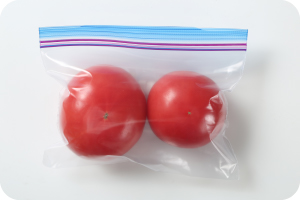 切り口から劣化しやすいので、トマトもミニトマトもヘタ付きのまま丸ごと冷凍用保存袋に入れて冷凍します。保存後に再度使用する際は、5分ほど室温に置けば、そのまま切ることができ、水にさらせば皮がツルンときれいにむけます。