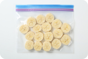 皮をむき輪切りにして、重ならないように冷凍用保存袋に並べ冷凍します。凍ったままでスムージーに、半解凍でシャーベットとして楽しめます。
