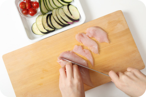 皮を取った鶏むね肉を繊維に沿って薄いそぎ切りにして、Aをもみ込みます。なすとズッキーニは5ミリメートル幅の斜め薄切りにし、ミニトマトは横半分に切ります。