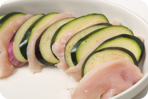 順に並べることで見た目も鮮やかになるほか、鶏むね肉のうま味が野菜に染み込んでおいしく仕上がります。