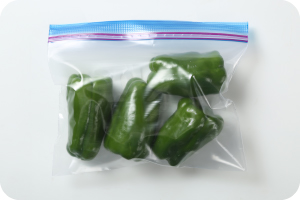 ピーマンは丸ごと冷凍用保存袋に入れて冷凍。カットするよりも劣化が少なく、おいしく保存できます。室温で5分ほど置けばそのまま切れるので便利。自然解凍をして水気を絞ればお浸しになります。カットしていると保存期間は1カ月程度です。