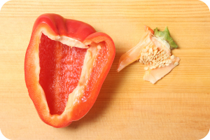 パプリカは水分が多いワタから傷むので、縦半分に切ってワタとタネを取り除きます。水気に弱いため切り口の水分をキッチンペーパーでしっかりと拭き取ってから、乾燥を防ぐためにラップで包むのがポイント。丸みがある方を下にすると重さで傷みやすくなるので、切り口を下にして野菜室で保存しましょう。