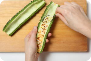 ゴーヤーはワタの部分に水分が多く、そのまま保存してしまうとワタから劣化が進みます。そこでゴーヤーを縦半分に切ってワタとタネをスプーンできれいに取り除き、切り口の水分をキッチンペーパーで拭き取ります。その後に切り口をラップで包み、下にして野菜室で保存しましょう。