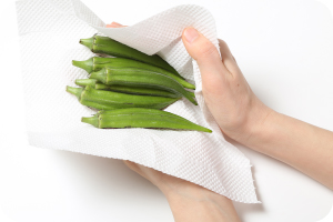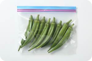 オクラはまとめてキッチンペーパーで包んでポリ袋に入れ、野菜室で保存しましょう。
