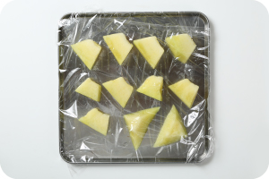 皮とタネを取って食べやすく切ります。金属トレイにラップを敷いて並べ、ラップをかぶせてから冷凍しましょう。バラバラに凍結させてから冷凍用保存袋に入れるとくっつかずに食べやすくなります。スムージーやシャーベットにも便利に活用可能。