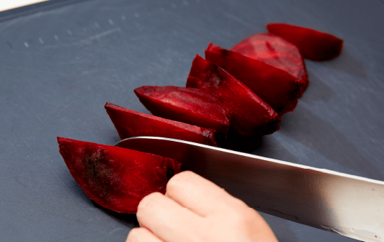 日本ではまだ馴染みがうすいものの、栄養価の高さや色の美しさで近年注目されているビーツ。寒さに強い野菜ゆえ、北海道では「レッドビート」という名称で親しまれており、作付けが広まりつつあります。その栄養価や美容面での効能などに注目した道内・愛別町では、ビーツのブランドを立ち上げ、6次産業化に挑戦しています。新鮮なビーツは薄く切ると歯ざわりもよく、食卓が華やぐような鮮やかな赤色も魅力。また、煮込み料理やオーブン焼きにすると、生とは違い、甘みが出てほっくりとした食感になります。生と加熱の食感や味の違いを、楽しんでみるのもおすすめです。