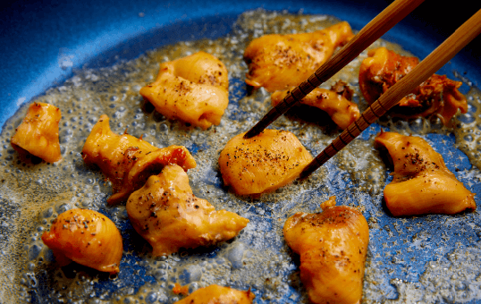 フライパンにバター10グラムを熱して、胡椒少々をふったホヤをさっと焼いて取り出す。(ホヤの匂いが気になる場合には、お酒も少々加えて焼くと匂いが薄まる。)