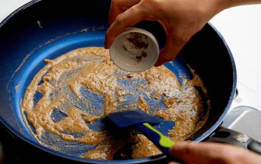 ホヤを取り出したフライパンにバター20グラムを入れ、クミンパウダー、小麦粉を炒める。
