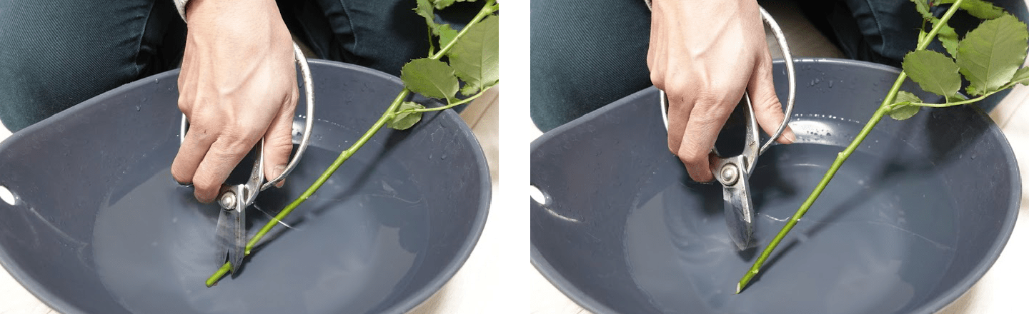 花が水を吸う手助けをする技を水あげといいます。その中のひとつが「水切り」で、根本から3センチメートルほどのところで茎を切ります。容器の底の方など、深いところで圧をかけて切ると花が水を吸いやすいとされています。5分から10分ほど水につけ、花が水を十分に吸ったら、花瓶へうつしましょう。