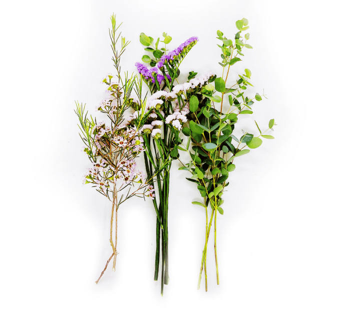 まずは花を並べて出来上がりをイメージしてみましょう。全体の長さや束ねる部分のバランスもチェックしながら下葉を取ります。飾る予定の場所の目線の高さなども意識してみてください。