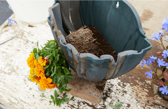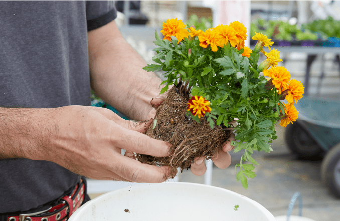 ポットから苗を取り出したら、バスケットに入るように少し根を取ります。根が乾かないうちに素早く取るのがポイントです。