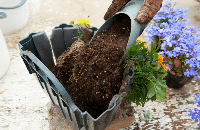 水はけを良くするために鉢底石などを下に入れ、赤玉土や腐葉土などの培養土を順にいれます。粒の大きい物を下に入れるのがポイントです。