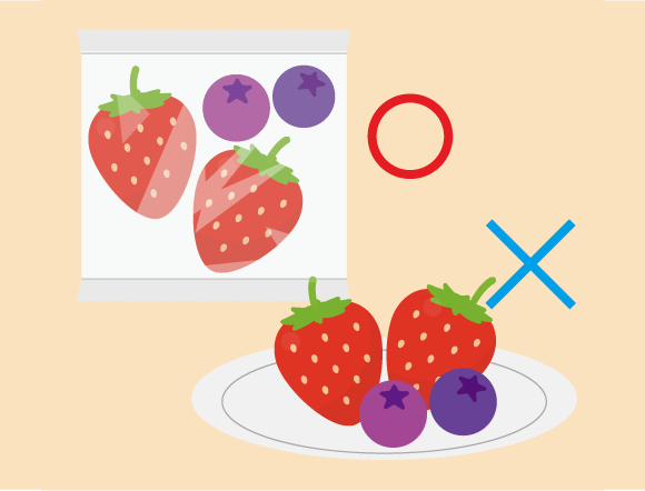 冷凍果実は、涼しいところで自然解凍し、解凍しすぎない状態で食べましょう。外気に触れると酸化してビタミンなどの栄養分が失われるため、なるべく包装のまま解凍します。生の果実より品質変化が早いので、食べる時間に合わせて必要な分だけ解凍しましょう。