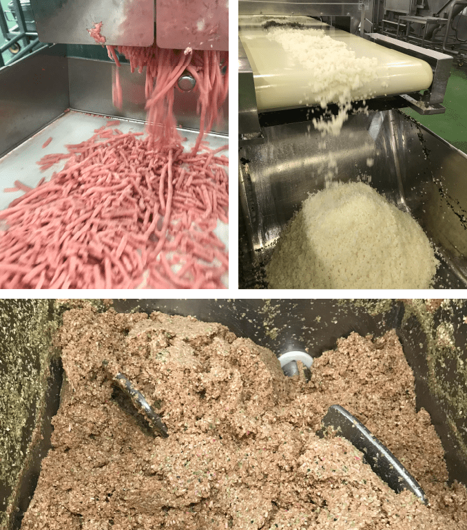 下:調味料と具材をこね合わせている様子。肉はミンチに、野菜は水洗い後に持ち味が出るように均一にカットし、ミキサーで調味料と具材をこね合わせます。食材のカットはトレンドを意識して、野菜の食感や肉のごろごろ感を出すようにしています。