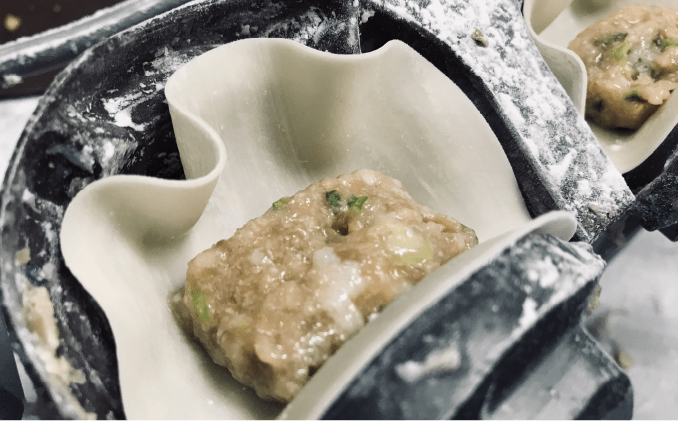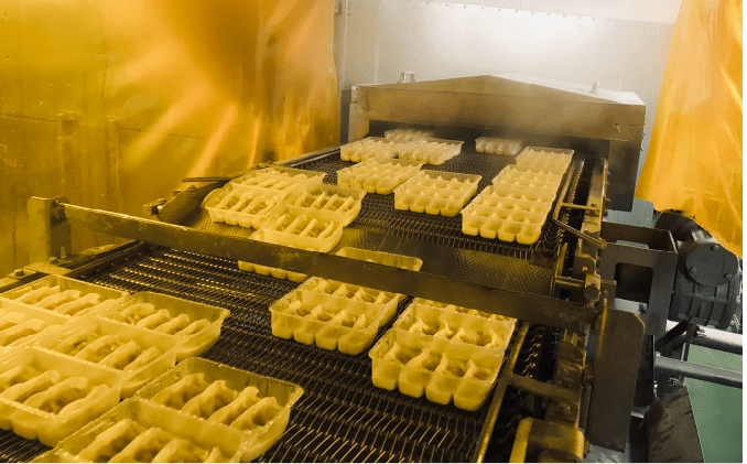 包んだ餃子をトレイにのせて蒸し加熱します。