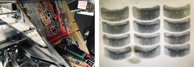 自動でフィルム包装し、問い合わせ番号を印字。 X線写真も含め、商品ごとの問い合わせ番号で製造時間や原料の詳細などを徹底管理しています。