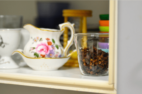 グラスや小皿にクローブを入れ食器棚に。爽やかな香りで、こもりがちな食器の匂いもすっきり。