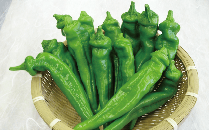 大正時代に京都府舞鶴市万願寺地区で発祥。肉厚で柔らかい果肉と、とうがらしの仲間でありながら辛みがなく、さわやかな甘い香りと、ほのかなとうがらしの香りが特徴の甘味種とうがらしです。旬は5月中旬から10月下旬頃。