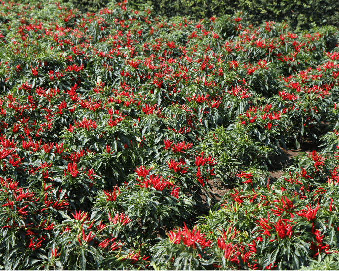 内藤とうがらしの畑。空に向かって上向きに実をつける様子は赤い絨毯のよう。