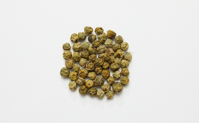 未熟果を摘みとり、塩漬けまたは乾燥させたもので、緑色でフレッシュ感のある爽やかな辛みが特徴。料理にトッピングしてきれいな色味を楽しんだり、さわやかな香りを生かしてソースやドレッシングに使うのもおすすめです。