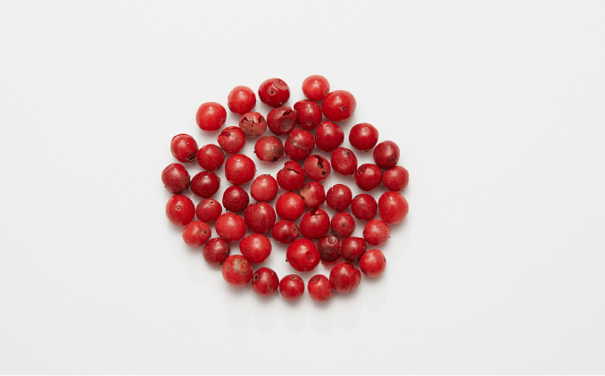 ウルシ科のコショウボクという植物の果実を乾燥させたものが日本では多く流通していて、辛みはなく、すっとした香味があります。肉や魚料理の彩りにはもちろん、デザートのトッピングとしても活躍します。バニラアイスに軽く潰してアラザン代わりにしたり、ホールのままチョコレートケーキに添えると華やかに。