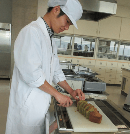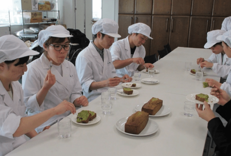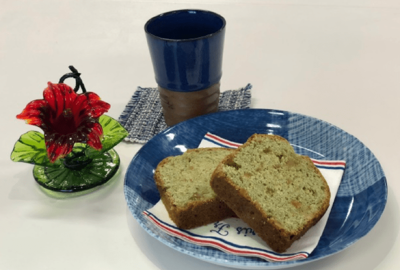 近藤教授が所属する生活科学部管理栄養士養成課程では、学科行事として、大学祭で3年生が主体となってパウンドケーキを製作して販売するというイベントが50年以上続いています。そこで、藍を使用した最初のレシピ提案として、藍葉入りのパウンドケーキが製作されることになりました。