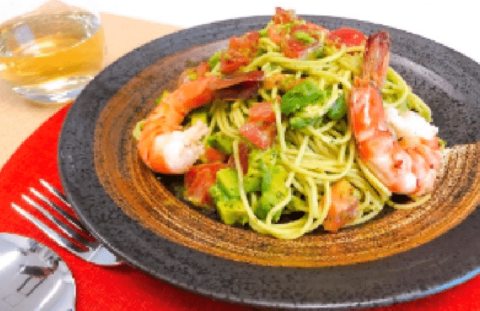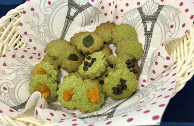 藍と聞くと、藍染のブルーを思い浮かべる人が多いと思いますが、“食藍”では藍の葉そのものを利用するため、葉を加工した料理やお菓子は緑色に染まります。
