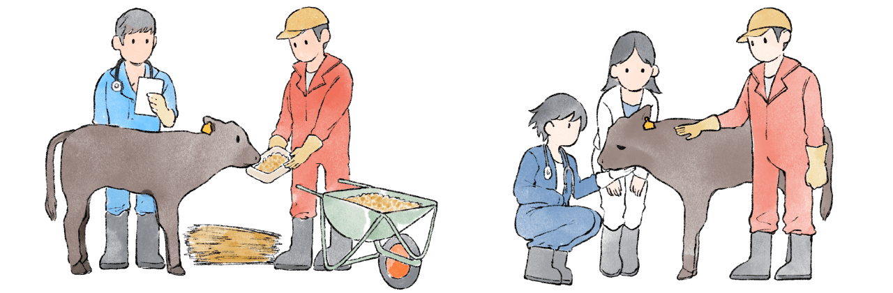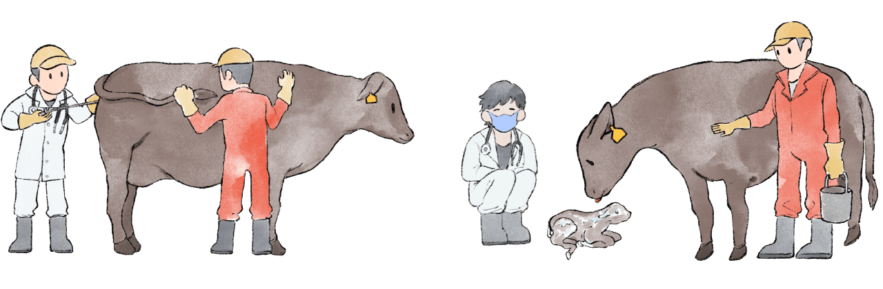 獣医師は、畜産農家の方々と二人三脚で牛の一生に寄り添います。病気の予防や治療はもちろんのこと、飼育環境に対するアドバイスや、繁殖のサポート、栄養の管理なども獣医師の重要な仕事です。