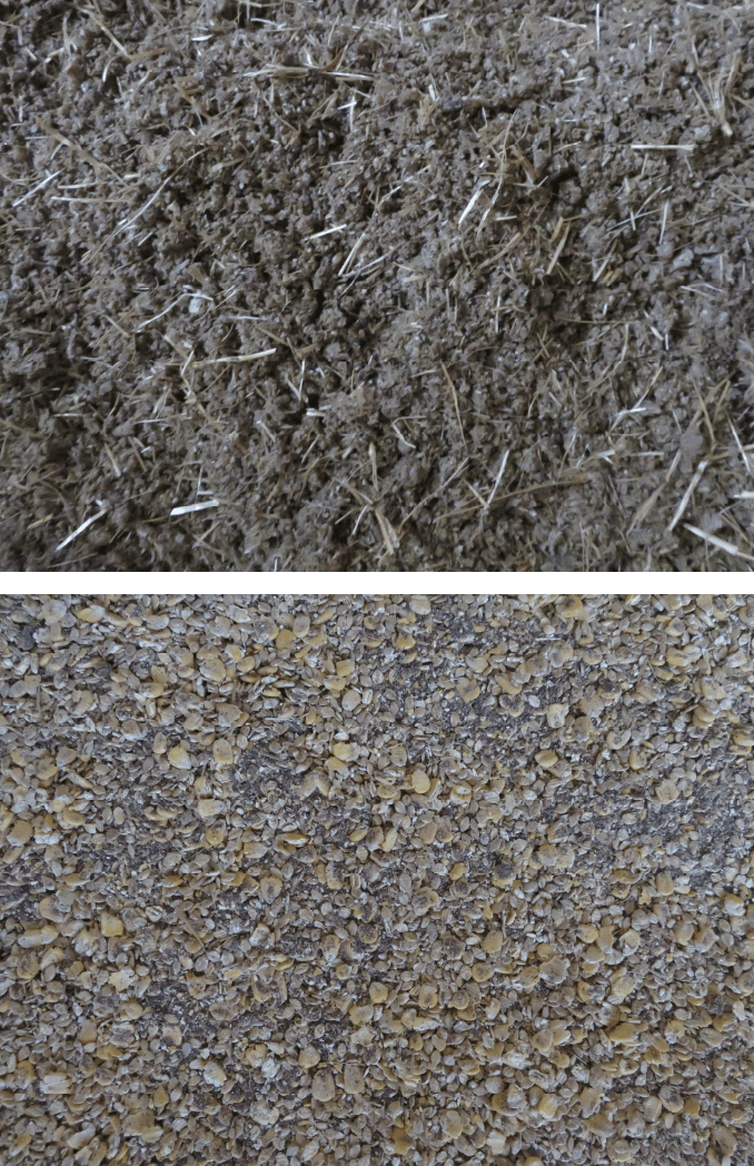 (上)おからを配合した発酵飼料(おからサイレージ)(下)乳牛の配合飼料。