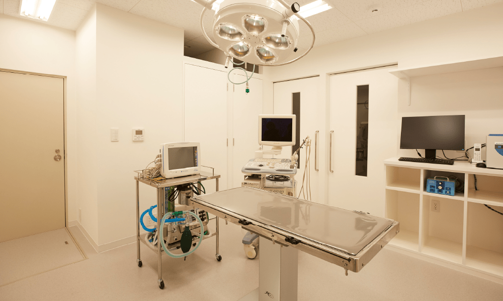 診察室の奥にある処置室。さまざまな動物たちがここで手術などの治療を受けます。