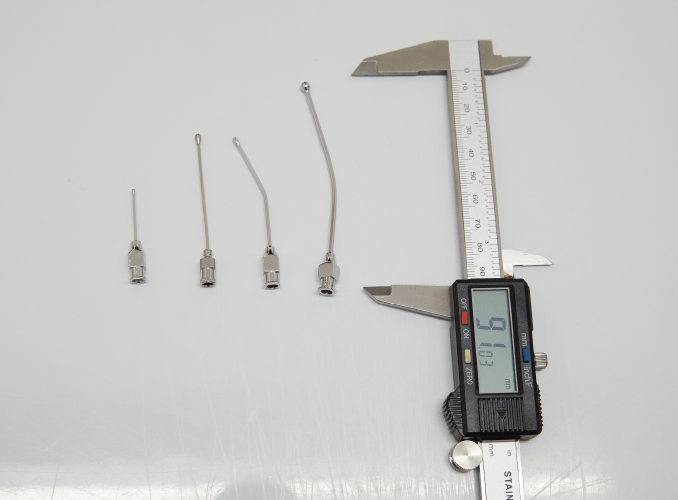 鳥の「そのう※」検査用の金属製カテーテル。個体のサイズや種類によって長さが変化。