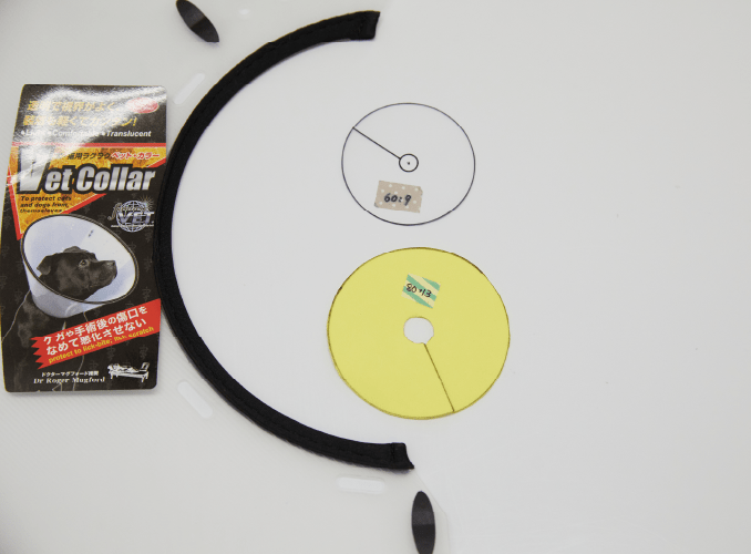 小さな鳥用に手作りしたエリザベスカラー。(左のカラーは通常サイズの市販品)