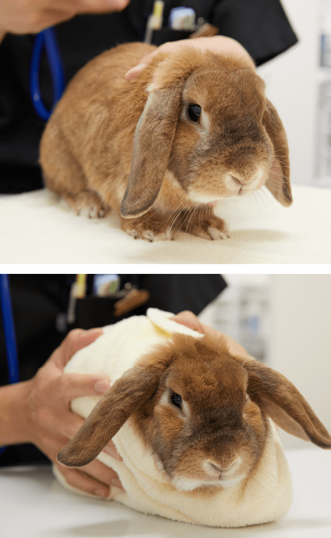 外耳炎や角膜炎、お腹の不調での来院が多いウサギ。骨格の異常や肺などを検査する際はレントゲンを撮ることも。この日は耳の検査のために来院。保定のためタオルで包んで診察します。
