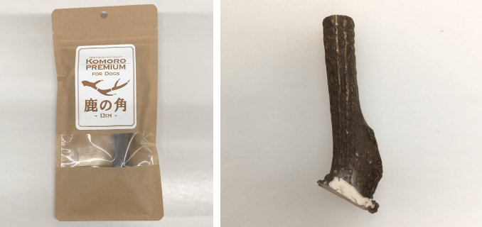 鹿の角を12センチメートルにカット。角をかじることで歯石が落ち、愛犬の口臭予防にも。