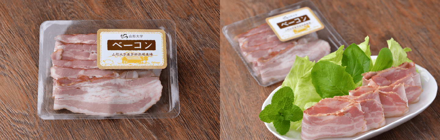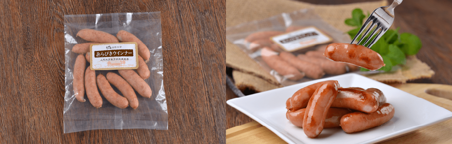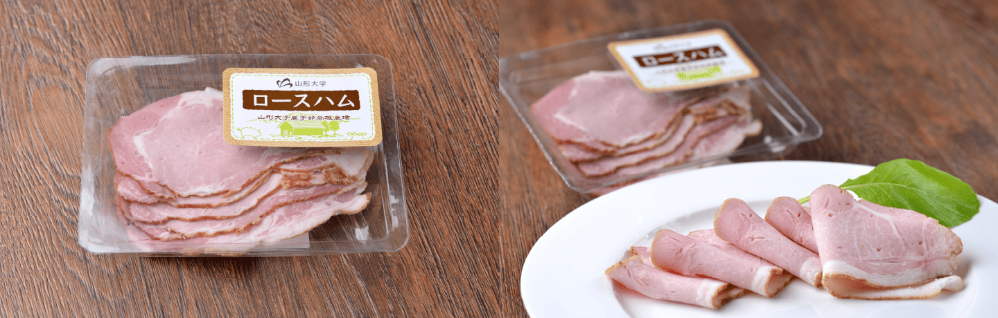 スマートテロワール開発商品の第一弾、ハム、ベーコン、ウィンナーは、地域の畑作協力農家が栽培したトウモロコシなどを中心とする飼料を使用して、地域の畜産協力農家が豚を育て、その豚肉で(株)東北ハムが製造を手がけ、「山形大学ブランド」として販売しています。