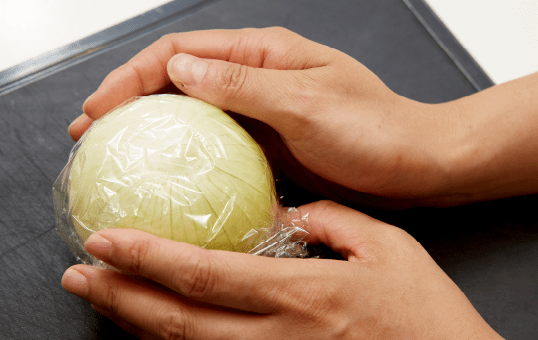 たまねぎは皮を剥き、ラップに包んで600ワットのレンジで2分ほど加熱する。