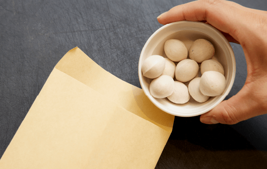 ぎんなんは、紙の封筒に入れて口を3回から4回折り、600ワットのレンジで30秒加熱し、殻をむく。殻が割れていないものは、キッチンバサミの中央部分(丸くあいた部分)などで潰す。