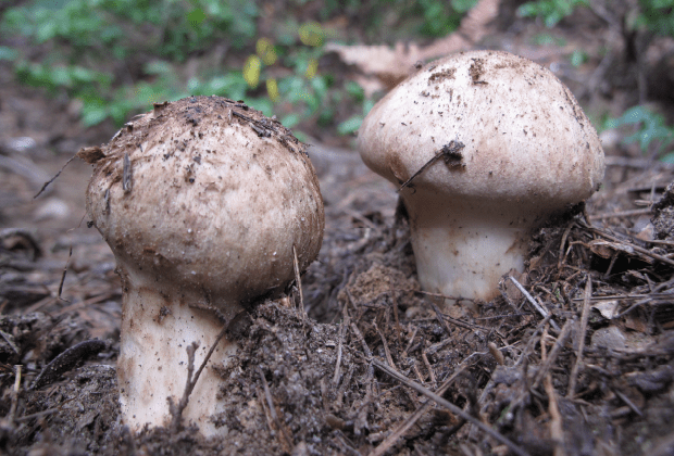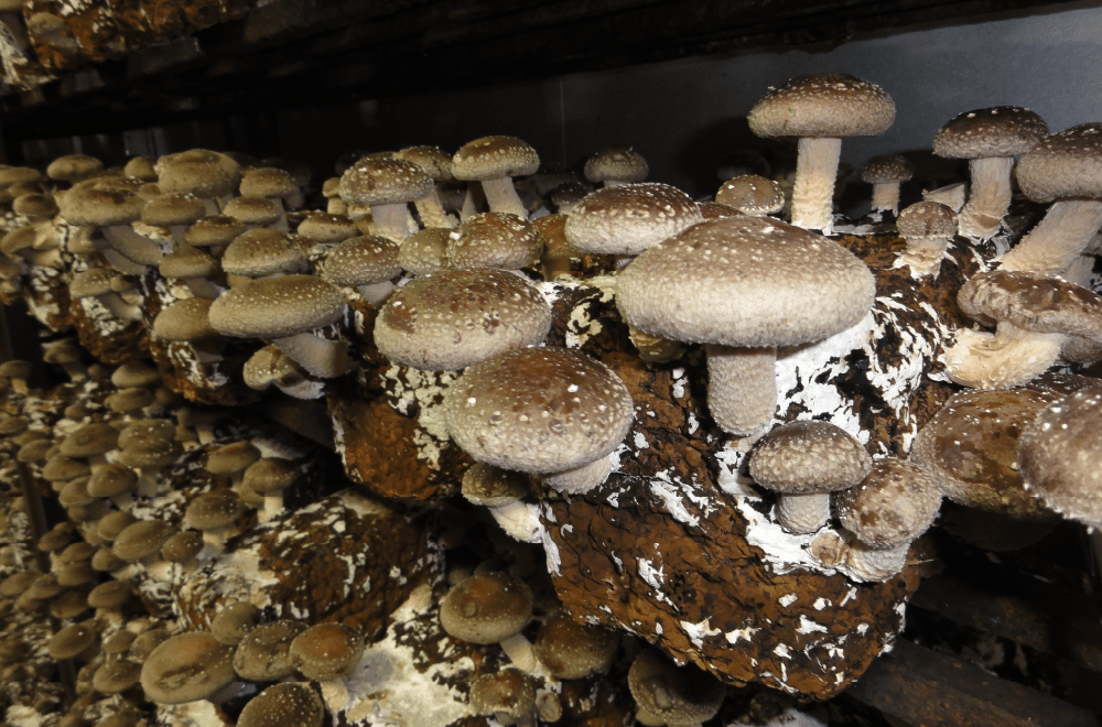 シイタケ菌床(シイタケの下にある白い部分が菌糸体)。