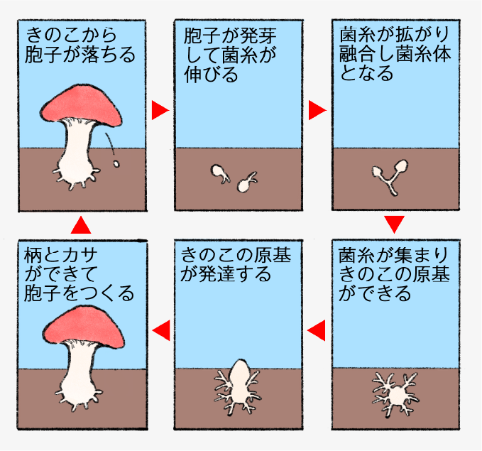 きのこで作られた胞子が、風などにより飛散して、倒木や落ち葉などの上に落ちて、条件が良ければ発芽します。そして、胞子から菌糸が伸び、養分を吸収して拡がり、菌糸体となります。その後、栄養条件や温度、湿度などの環境条件に応じて、まず、菌糸体の一部で菌糸が密に集合して、きのこの元になる原基が形成され、これが発達して柄と傘ができ、きのことなります。