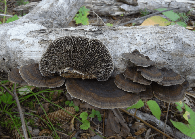 シイの倒木から発生している木材腐朽性きのこ 「チャカイガラタケ」。