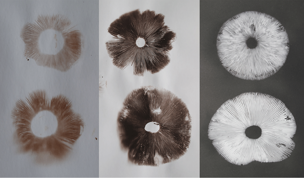 さまざまなきのこの胞子紋。左:フウセンタケ属(赤錆色)、中:ハラタケ属(紫褐色)、右:テングタケ属(白色)。