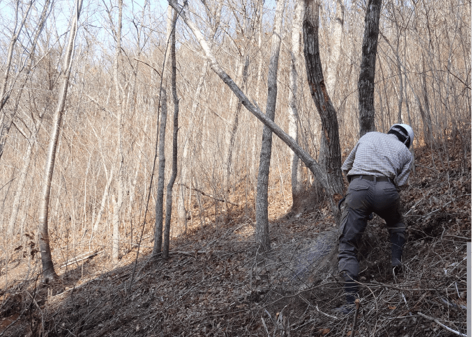 伐採前の木にナタで一筋切り込みをいれ、すぐに耳をあてて原木の中を流れている「樹液の音」を聞きます。音がピタッと止まれば伐採しどき。しかし、水の音が止まらず流れるようであれば伐採には向きません。