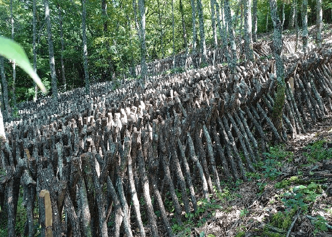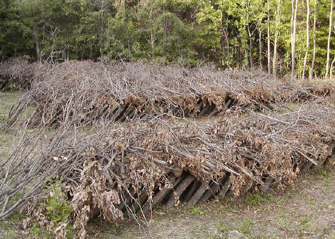 植菌した原木を、日当たりの良い林の中などに横積みしておきます。これを「仮伏せ」といいます。膝の高さまで積み上げて、乾燥する場所では、ネットや小枝で覆い、1カ月から2ヶ月間寝かせて菌を定着させます。