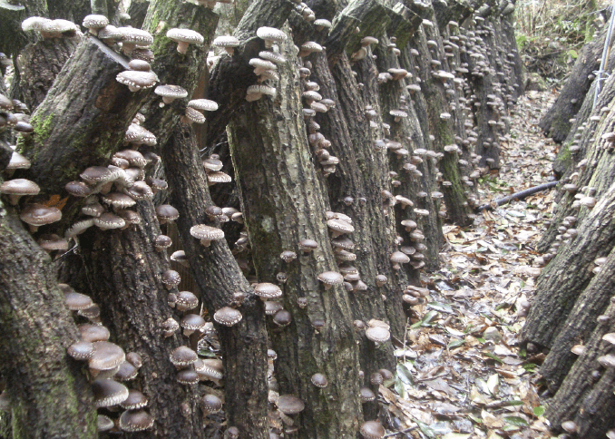 植菌した年の翌年の秋口に、原木をきのこの発生に適した「ほだ場(雨がよく当たり、直射日光が当たらない林の中など)」に移し、きのこを採取しやすい様に立てかけます。